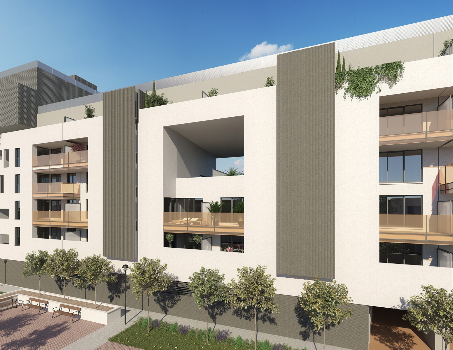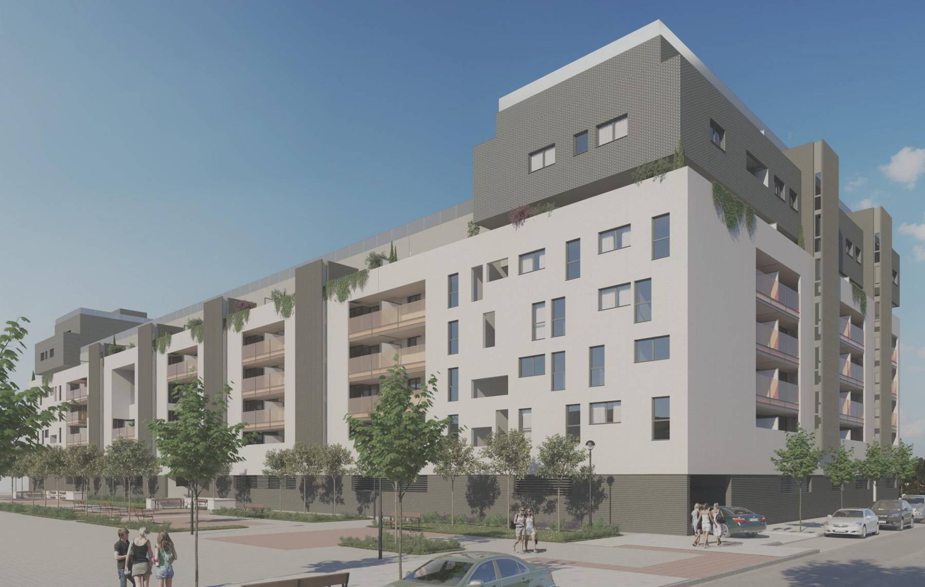 - FACHADA: Fachadas en combinación de paneles prefabricados de hormigón y revestimiento tipo SATE, en combinación de varios colores. En todos los casos el aislamiento se coloca en el exterior evitando puentes térmicos y reduciendo la demanda energética.Barandillas de vidrio de seguridad colocado para garantizar tanto la iluminación de las terrazas como la privacidad de las mismas.Petos de terrazas y áticos con acabados de SATE guardando en todo momento la armonía de la fachada.
